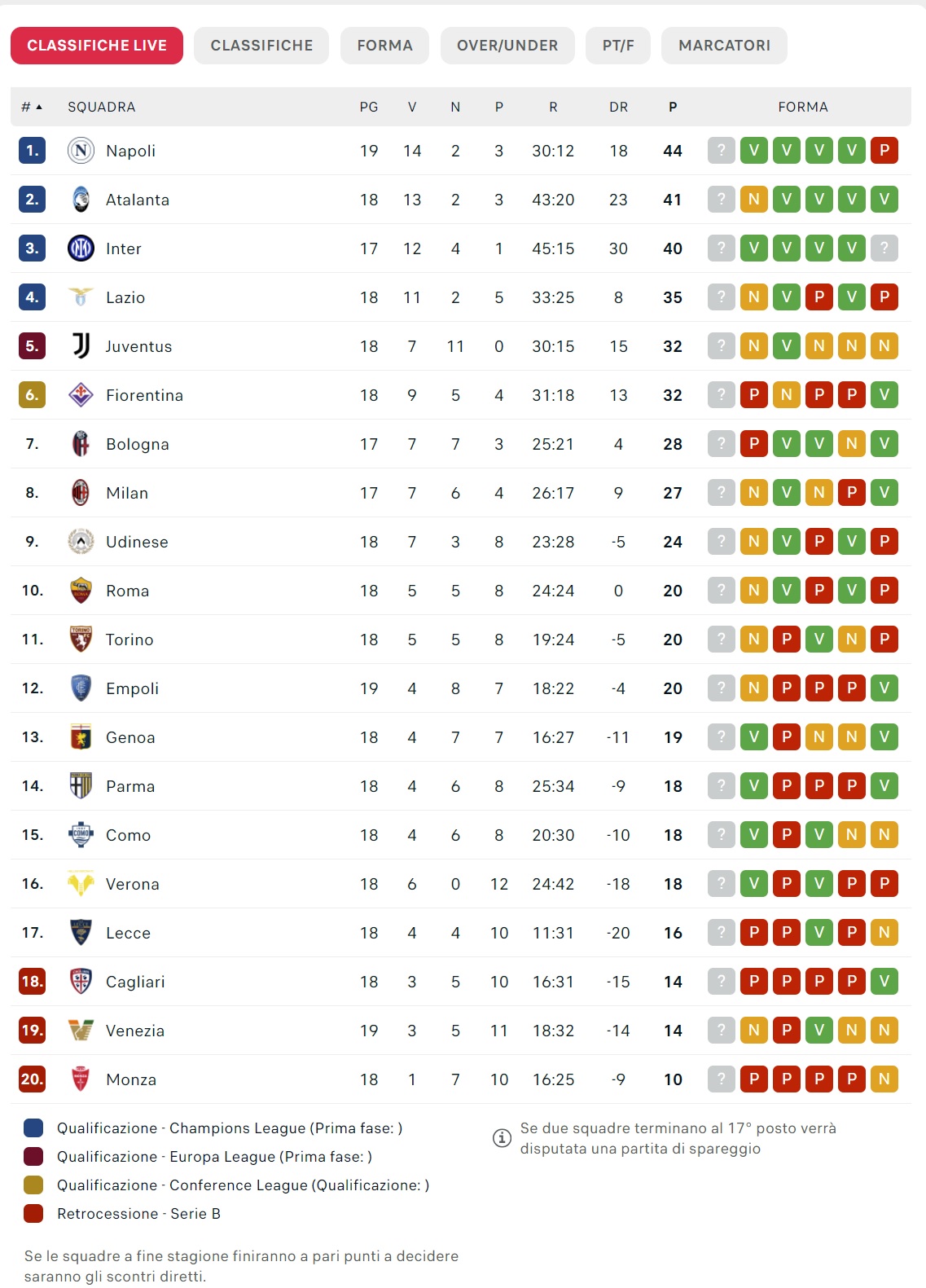 CLASSIFICA - Il Napoli vola in testa da solo! Chiuso il girone d'andata a 44 punti