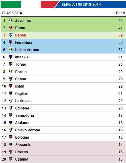Con gli azzurri che, grazie alla vittoria sulla Sampdoria, sono riusciti a tenere lontana la Fiorentina ed avvicinare la Roma (distante ora solo due punti) la classifica appare delineata per le prime posizioni. Ad insidiare le prime quattro della classe ci pensa un incredibile Verona, prossimo avversario del Napoli, a quota 32 punti e davanti all'Inter in attesa della sfida dei nerazzurri con la Lazio prevista per le 18:30.