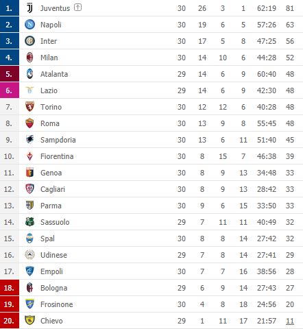 Accorcia le distanze l'Inter sul Napoli in classifica. La vittoria per 4-0 a Genova contro il Genoa, arrivata dopo la sconfitta per 2-1 del Napoli a Empoli, permette ai nerazzurri di portarsi a -7 dalla squadra di Carlo Ancelotti. Gli azzurri, comunque, in virtù della sconfitta della Lazio, tengono blindata la posizione Champions con ben 16 punti di vantaggio sui biancocelesti (battuti dalla Spal) quinti con 48 punti, gli stessi di Atalanta, Torino e Roma.