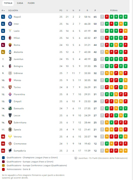 CLASSIFICA - L'Inter si riprende il secondo posto e accorcia sul Napoli a -15