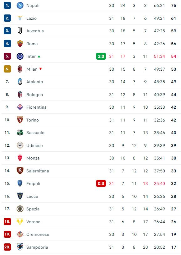 L'Inter batte 3-0 l'Empoli e sale al quinto posto scavalcando il Milan che in questo momento è sesto in attesa di sfidare il Lecce. Con questa classifica le milanesi sarebbero fuori dalla Champions League del prossimo anno.