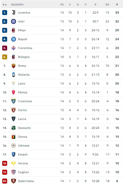 Nell'altra partita l'Udinese si fa rimontare sul 3-3 dall'Hellas Verona all'ultimo respiro. I friulani si portano così a quota 12 punti, proseguendo l'astinenza dalle vittorie che dura ormai da un mese. Per gli scaligeri, invece, la zona salvezza resta a un punto.