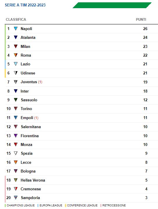 La Juventus batte l'Empoli, ottiene il secondo successo di fila e prova a continuare la sua risalita in classifica. I bianconeri si portano a 19 punti, al settimo posto in classifica, a -3 dal quarto occupato dalla Roma e -7 rispetto alla vetta del Napoli. Ovviamente con una gara in più.