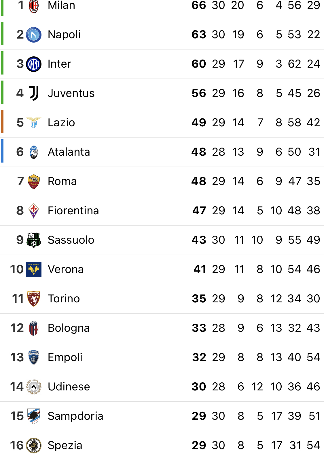 Con la vittoria contro la Salernitana, la Juventus sale a quota 59 punti in classifica blindando il quarto posto. I bianconeri restano a -4 dal Napoli ma sono virtualmente a -5 essendo dietro negli scontri diretti con gli azzurri. Ecco la nuova parziale classifica: