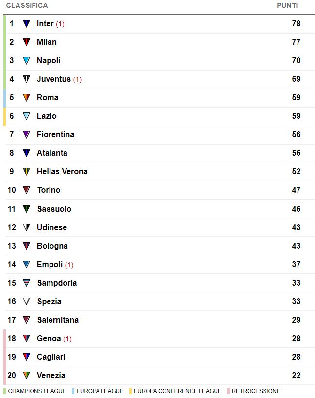 Dopo il successo dell'Inter sull'Empoli, la Juventus esce clamorosamente sconfitta da Marassi per 2-1 nel secondo anticipo della 36^ giornata di Serie A, fallendo il momentaneo sorpasso al Napoli al terzo posto. Con i tre punti firmati Gudmundsson e Criscito, il Genoa aggancia il Cagliari e può ancora sperare. Questa la graduatoria aggiornata: