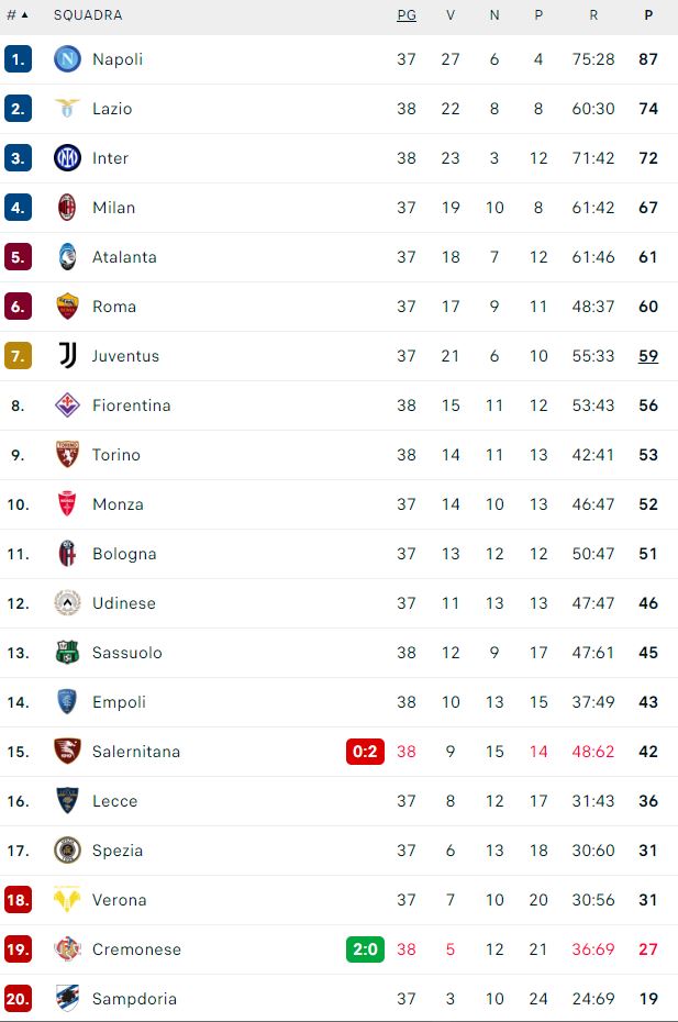 Si sono chiusi i campionati di Lazio, Empoli, Salernitana e Cremonese. Maurizio Sarri arriva al traguardo secondo, senza dover aspettare le altre: controsorpasso all'Inter servito. La Salernitana pure già conosce la sua posizione e chiude al quindicesimo posto.