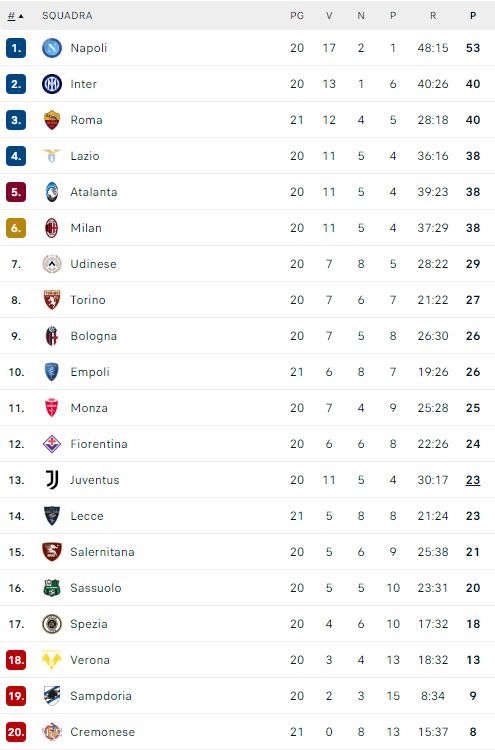 CLASSIFICA - La Roma aggancia l'Inter alle spalle del Napoli e torna a -13