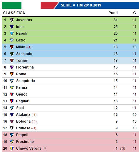 Ecco la classifica di Serie A dopo i match disputati finora: la Lazio si riavvicina a Napoli e Inter, distanti quattro punti, il Toro di Mazzarri risale la china superando Fiorentina e Roma, che scivolano all'ottavo posto.
