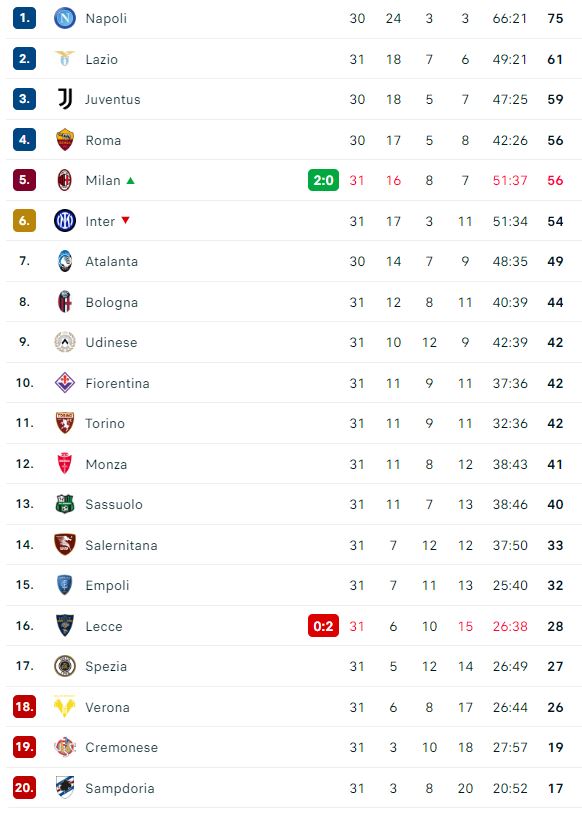 Il Milan di Pioli batte 2-0 il Lecce e sale a quota 56 punti in classifica ma è comunque fuori dalla zona Champions e si trova a -19 dal Napoli in attesa della sfida degli azzurri contro la Juventus. Ecco la classifica parziale: