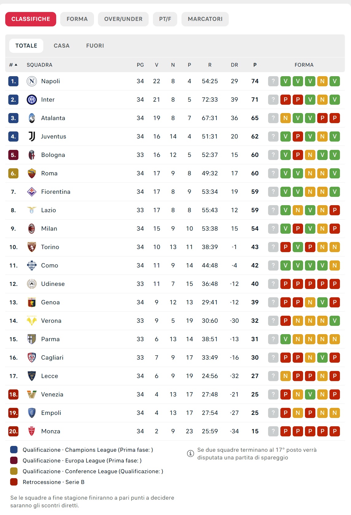 Serata pesantissima quella del Maradona, perché il Napoli vince 2-0 contro il Torino e mette la freccia nella volata Scudetto contro l'Inter. Decisivi i due gol dell'ariete scozzese McTominay, che ha fatto esplodere la festa azzurra per il sorpasso ai danni dell'Inter. Nell'altra partita di serata, invece, impattano sul punteggio finale di 1-1 l'Atalanta e il Lecce: per la Dea significa tenere la Juventus a una distanza di sicurezza, 3 punti, in attesa della partita di domani a Udine del Bologna. Il salentini mettono un punto in cascina e allungano a +2 sulla coppia composta da Venezia ed Empoli, le quali sarebbero ad oggi retrocesse in B. Di seguito la classifica aggiornata di Serie A.