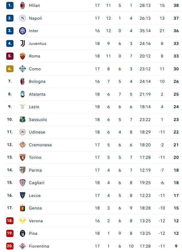 Seconda vittoria di fila per il Napoli in campionato. Azzurri ora secondi a 37 punti a -1 dal Milan. Scavalcato l'Inter in campo stasera col Bologna. Staccata la Juve or adistante 4 punti, così come la Roma. Entrambe sono ferme a 33 punti. Ecco la nuova classifica: