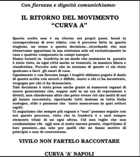 Il movimento "Curva A" torna a popolare le gradinate del San Paolo. In un comunicato, le motivazioni della scelta, alla quale, secondo quanto raccolto da Tuttonapoli, non ha comunque aderito la totalità dei gruppi organizzati.