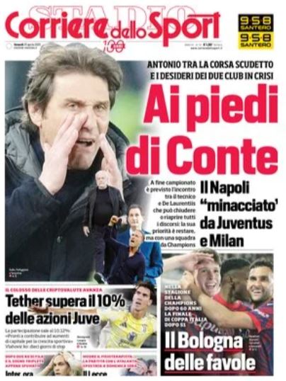 "Ai piedi di Conte". Questo è il titolo principale della prima pagina di oggi del Corriere dello Sport. Napoli "minacciato" da Juventus e Milan: Antonio tra la corsa scudetto e i desideri dei due club in crisi. A fine campionato è previsto l'incontro tra il tecnico e De Laurentiis, che può chiudere o riaprire tutti i discorsi. La sua priorità è restare, ma con una squadra da Champions.