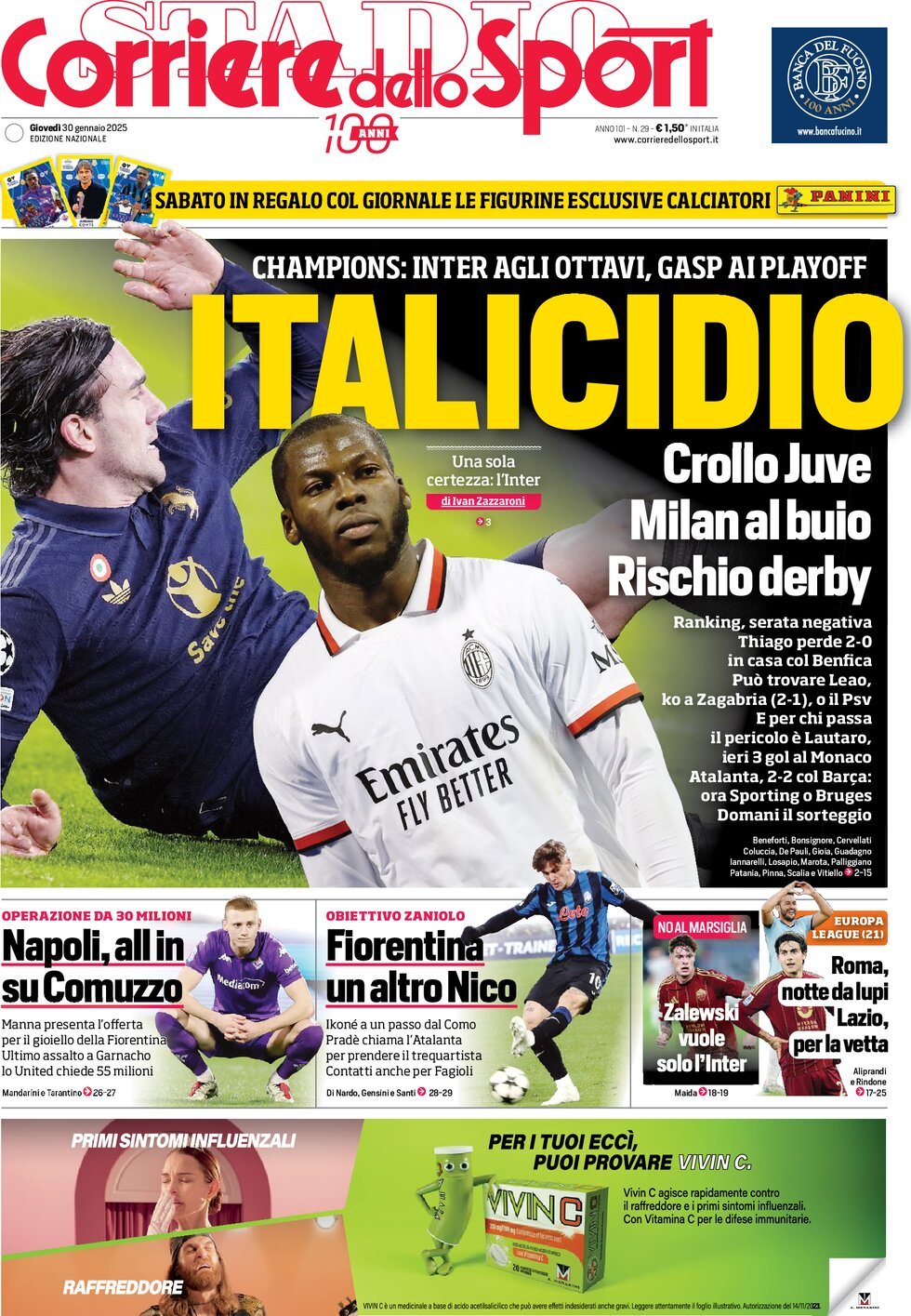 "Italicidio". Così titola oggi in prima pagina il Corriere dello Sport. Ranking, serata negativa: Thiago perde 2-0 in casa col Benfica. Può trovare Leao, che col suo Milan va ko a Zagabria. E per chi passa il pericolo è Lautaro, che fa 3 gol al Monaco. Pari per Atalanta e Bologna.