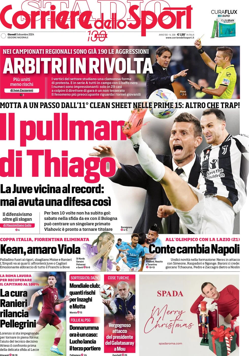 "Il pullman di Thiago" scrive Corriere dello Sport in apertura sulla difesa da record della Juve. Thiago Motta a un passo dall'undicesimo clean sheet nelle prime 15 partite: altro che Trap, scrive il quotidiano. Mai avuta una difesa così. Sabato nella sfida da ex contro il Bologna può centrare un singolare primato. Vlahovic pronto al rientro.