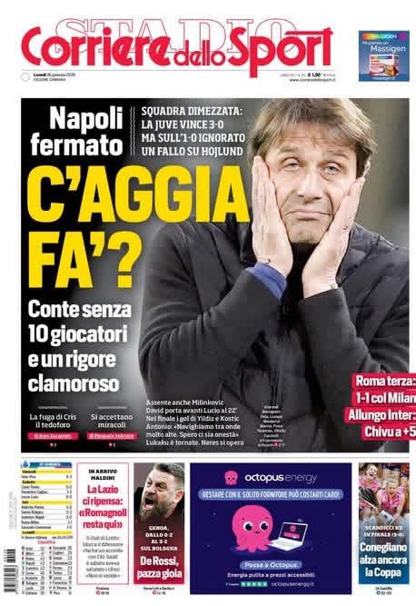 "C'Aggia fa?". Così titola l'edizione campana del Corriere dello Sport che scrive di un Napoli fermato e di una Squadra dimezzata: la Juve vince 3-0