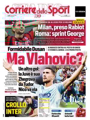 È dedicata alla Juventus gran parte della prima pagina dell'edizione odierna del Corriere dello Sport. I bianconeri passano con il minimo sforzo al Ferraris, battendo il Genoa 1-0 grazie alla rete del serbo che decide il match del Ferraris dopo essere entrato dalla panchina: "Ma Vlahovic?" , recita il titolo principale.