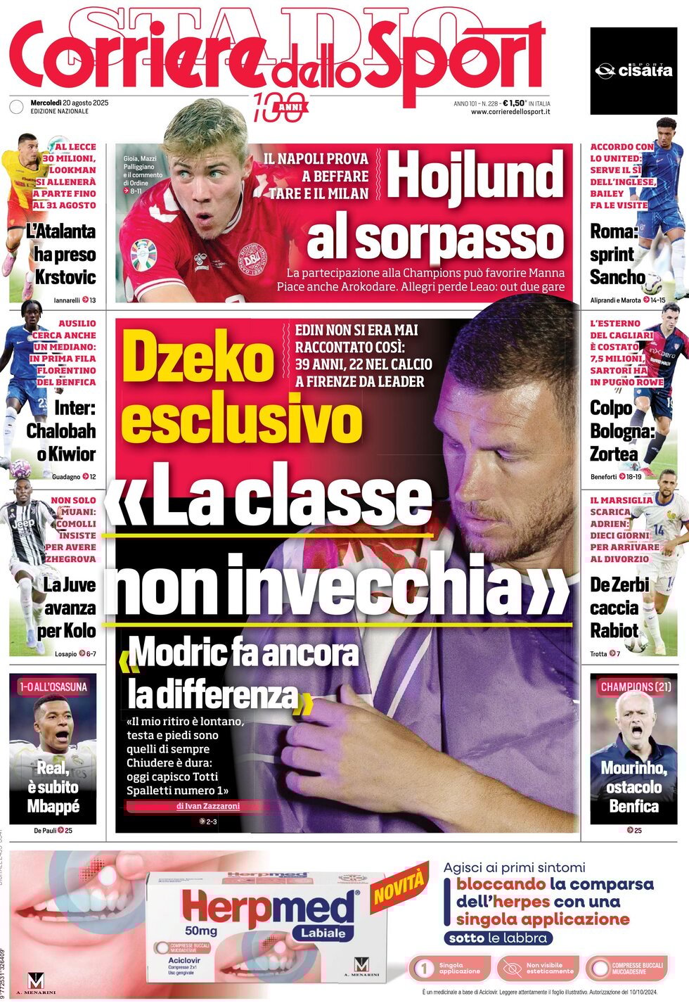 "La classe non invecchia": questo è il titolo principale della prima pagina del Corriere dello Sport, riferendosi ad un'intervista esclusiva concessa al quotidiano da Edin Dzeko. Il bosniaco non si era mai raccontato così: 39 anni, 22 nel calcio e a Firenze da leader. Prosegue l'ex Roma e Inter: "Modric fa la differenza. Il mio ritiro è lontano, testa piedi sono quelli di sempre. Chiudere è dura: oggi capisco Totti. Spalletti numero 1".