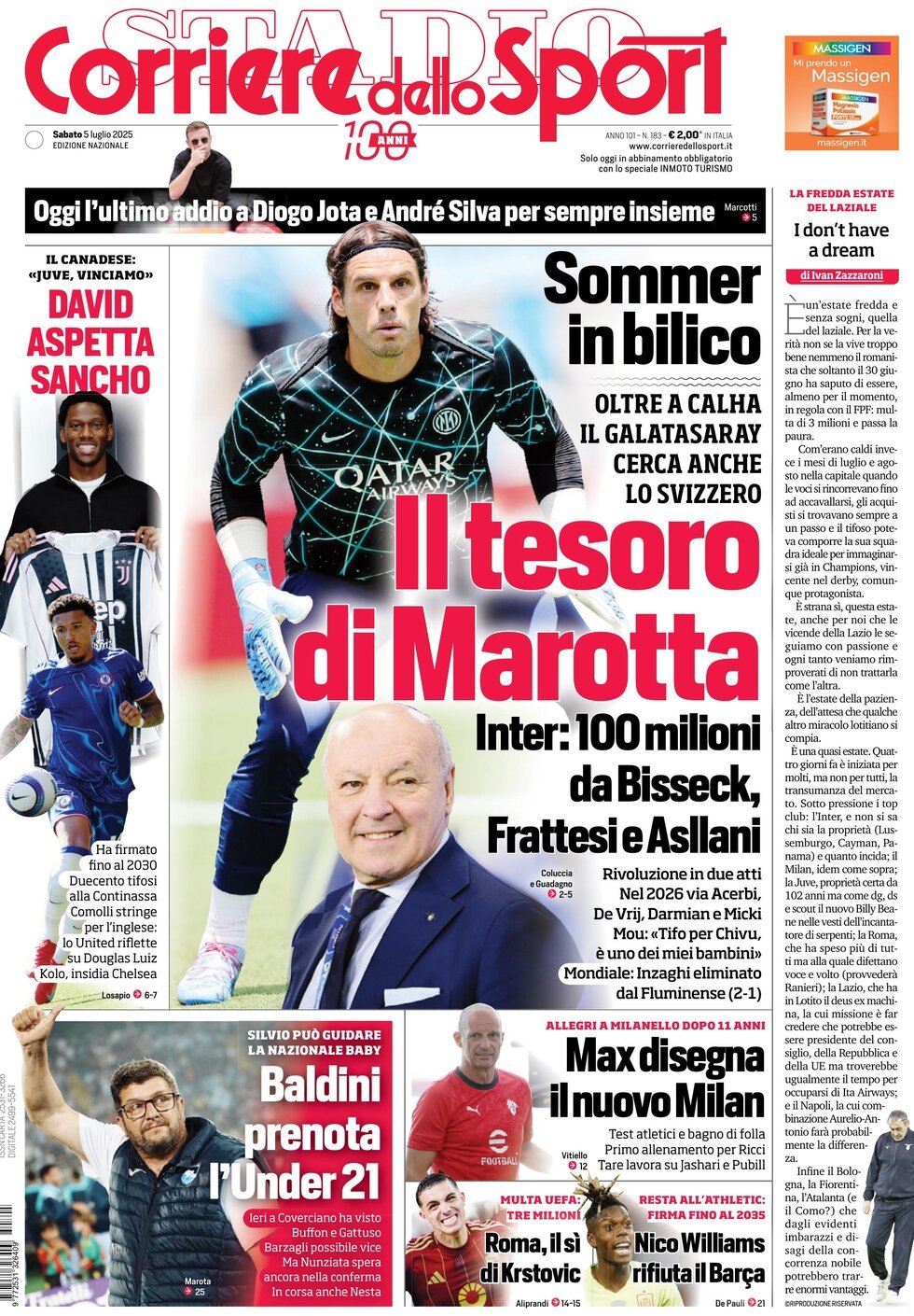 "Il tesoro di Marotta", il Corriere dello Sport nella sua edizione in edicola oggi dedica l'apertura in prima pagina al mercato dell'Inter: "100 milioni da Bisseck, Frattesi e Asllani. Rivoluzione in due atti. Nel 2026 fuori Acerbi, De Vrij, Darmina e Micki". E tra i partenti potrebbe esserci anche il numero uno nerazzurro: "Sommer in bilico. Oltre a Calha il Galatasaray cerca anche lo svizzero". Di spalla spazio al mercato della Juventus: "David aspetta Sancho. Il canadese: 'Juve, vinciamo'".