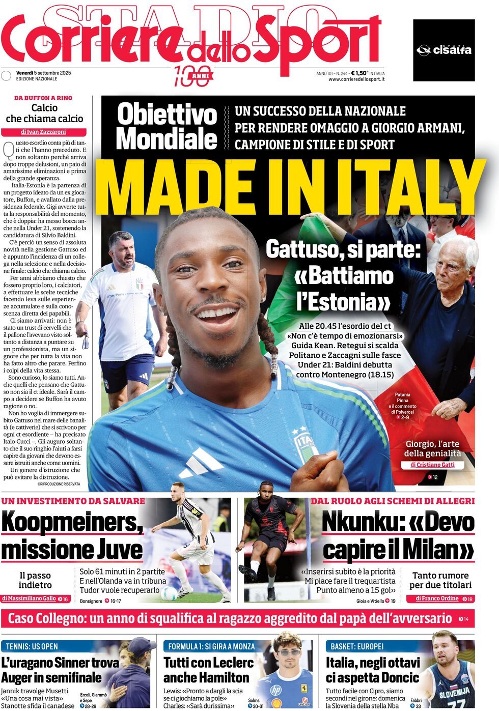 "Made in Italy": questo è il titolo principale della prima pagina del Corriere dello Sport. Obiettivo Mondiale per l'Italia: un successo della Nazionale per rendere omaggio a Giorgio Armani, campione di stile e di sport. Gattuso, si parte: "Battiamo l'Estonia". Alle 20.45 l'esordio del ct: "Non c'è tempo di emozionarsi". In avanti guida Kean.