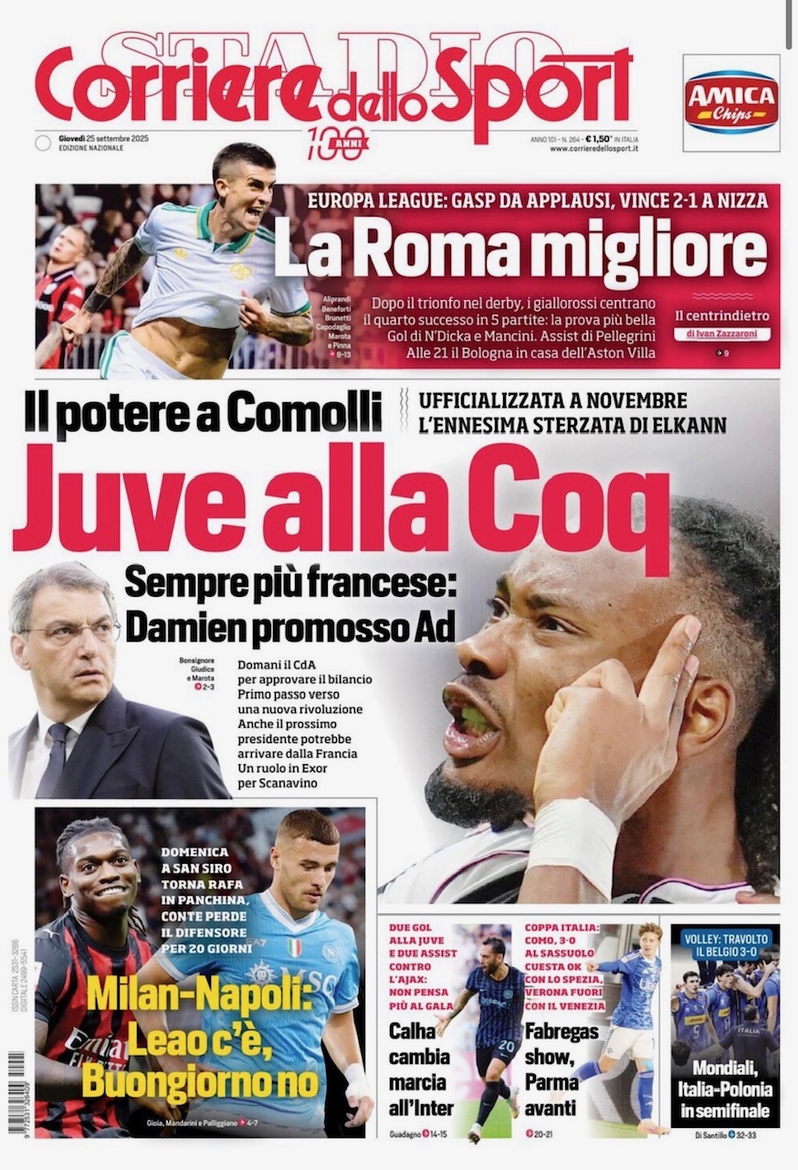 "Juve alla Coq": questo è il titolo principale della prima pagina di oggi del Corriere dello Sport. Il potere a Comolli: la società bianconera è sempre più francese, con Damien promosso ad. Domani il CdA per approvare il bilancio: primo passo verso una nuova rivoluzione. Anche il prossimo presidente potrebbe arrivare dalla Francia. Nel frattempo, un ruolo in Exor per Scanavino.