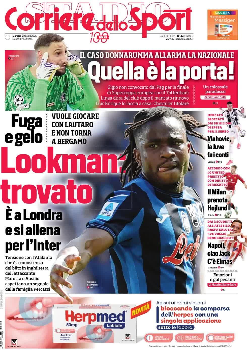 Il Corriere dello Sport in prima pagina si concentra sul caso Ademola Lookman, che ha praticamente rotto da parecchio tempo con l'Atalanta. L'attaccante quasi una settimana fa non si è presentato a Zingonia per gli allenamenti con i nerazzurri, una situazione che certifica la tensione tra le parti. Lookman al momento si trova a Londra, dove si sta allenando da solo in attesa di una chiamata dell'Inter. Il centravanti infatti vuole soltanto l'Inter e attende sviluppi positivi della trattativa, tanto che Marotta e Ausilio attendono un segnale dai Percassi per affondare il colpo e regalare un nuovo innesto a Chivu. Di spalla si parla anche del Napoli con l'ufficialità di Raspadori all'Atletico Madrid e gli azzurri che ripensano a Elmas.