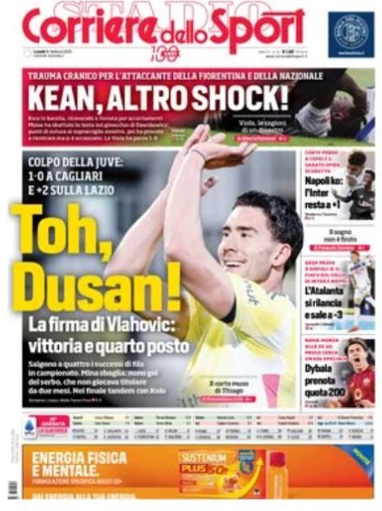"Toh Dusan". Titola così in prima pagina il Corriere dello Sport, che si sofferma sulla vittoria conquistata dalla Juventus contro il Cagliari. I bianconeri hanno vinto un match delicatissimo all'Unipol Domus, dove Dusan Vlahovic è risultato decisivo con una rete. L'attaccante ha ritrovato una maglia da titolare, punendo i sardi nel primo tempo e riportando la Juventus al quarto posto, con due lunghezze di vantaggio sulla Lazio.