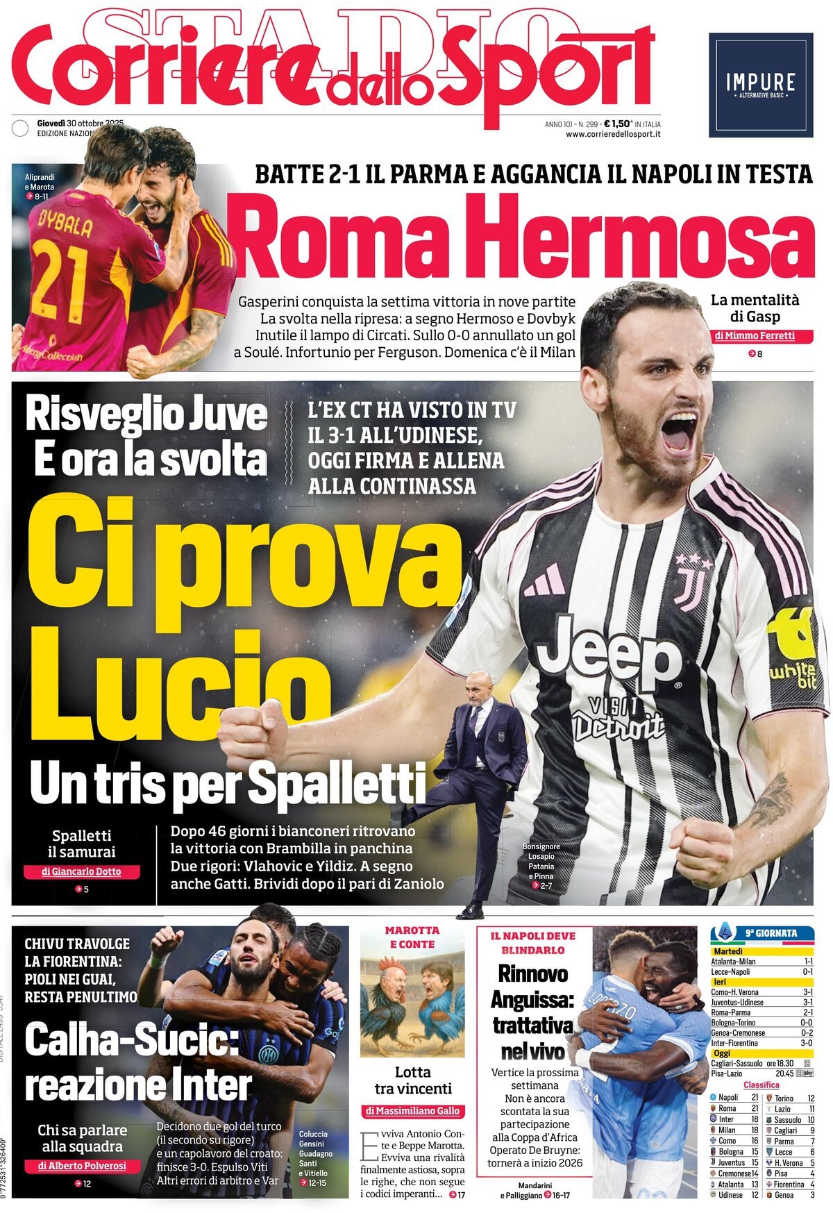 "Ci prova Lucio". Titola così in prima pagina il Corriere dello Sport, che si sofferma sulla vittoria della Juventus e sul nuovo corso targato Luciano Spalletti. I bianconeri sono riusciti a imporsi per 3-1 sull'Udinese sotto la guida di Brambilla, passando con i rigori di Vlahovic e Yildiz oltre che con il gol di Gatti, che ha risposto al momentaneo 1-1 di Zaniolo. Il tecnico della Next Gen adesso passerà il testimone all'ex Ct, che ha seguito la gara da casa ed è pronto a firmare il suo contratto con la Juventus.