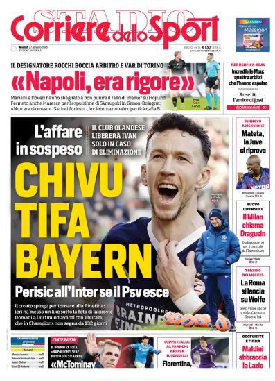 L'intreccio tra campo e mercato domina le prime pagine e riporta l'Inter al centro del racconto. Il titolo del Corriere dello Sport è emblematico: "Chivu tifa Bayern", con i nerazzurri che guardano con interesse particolare alla sfida di domani sera tra PSV e Bayern Monaco. Sullo sfondo infatti continua a prendere forma anche il dossier legato a Ivan Perisic, ipotesi che tornerebbe d'attualità solo in caso di uscita del PSV dall'Europa, a conferma di una strategia che resta legata ai verdetti continentali e agli incastri di febbraio. In questo quadro si inserisce anche il tema legato a Marcus Thuram, chiamato a ritrovare il gol europeo a Dortmund contro il Borussia Dortmund: la sua risposta sul campo può pesare tanto sul destino europeo dell'Inter quanto sugli equilibri di una stagione che entra nella fase decisiva. "Rocchi boccia arbitro e Var di Torino" si legge invece in alto in riferimento a Juve-Napoli di domenica.