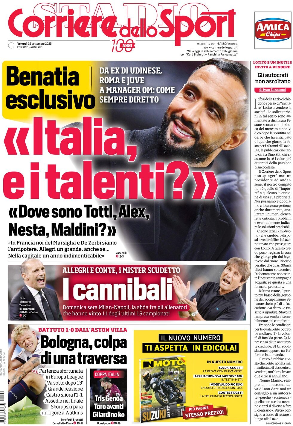 "Italia, e i talenti?": questo è il titolo principale della prima pagina di oggi del Corriere dello Sport. Parole di Benatia, ex difensore di Udinese, Roma e Juve intervistato dal quotidiano e ora manager del Marsiglia. La sua intervista è stata senza troppi peli sulla lingua. Prosegue: "Dove sono Totti, Alex, Nesta e Maldini? I Francia noi del Marsiglia e De Zerbi siamo l'antipotere". Un altro titolo importante è il seguente: "I cannibali". Allegri e Conte, i mister scudetto. Domenica sera Milan-Napoli, la sfida fra gli allenatori che hanno vinto 11 degli ultimi 15 campionati.