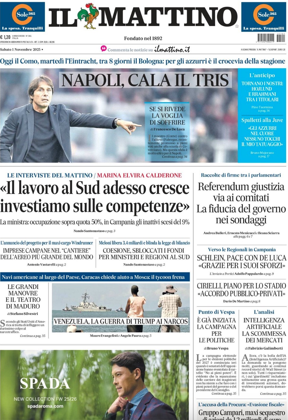 "Napoli, cala il tris", il titolo in prima pagina dell'edizione odierna de Il Mattino. Tre partite fondamentali per il Napoli. Una settimana, o meglio otto giorni, che possono rappresentare il crocevia della stagione. Si parte oggi con la sfida al Como di Fabregas per poi passare al match di Champions Lsague contro l'Eintracht Francoforte e si chiude il ciclo con la partita contro il Bologna. Di seguito la prima pagina integrale