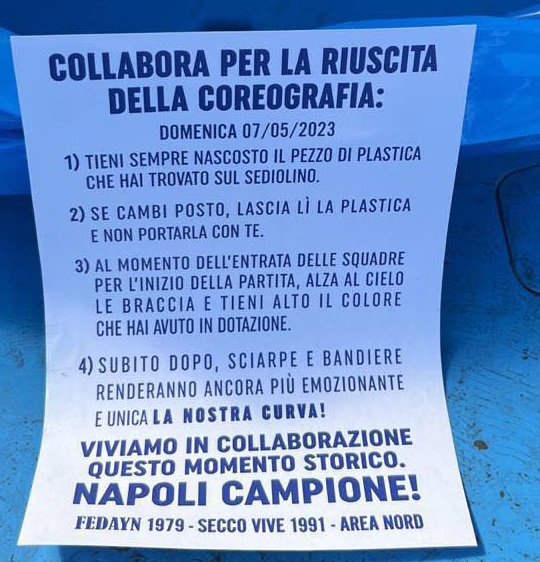 E' tutto pronto al Maradona per Napoli-Fiorentina e la festa per il terzo Scudetto degli azzurri. I gruppi organizzati hanno diffuso un volantino, presente su ogni sediolino insieme ad un cartoncino colorato, con delle istruzioni ben precise da seguire per la realizzazione della coreografia che dovrà essere realizzata. Come parte della coreografia in Curva A sarà realizzata un’enorme bandiera tricolore e il numero 3 al centro. Di seguito il volantino.