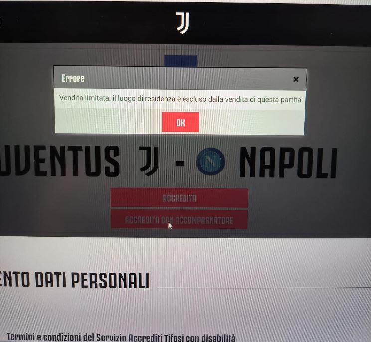 La Juventus non permette ai tifosi napoletani disabili di acquistare un biglietto per Juventus-Napoli di venerdì prossimo. Lo rende noto un tifoso, che ha provato ad acquistare il tagliando, e il giornalista Carlo Alvino pubblica sui suoi account social la protesta del diretto interessato: "Ricevo e pubblico con piacere ricordando che lo scorso 3 dicembre si è celebrata la giornata mondiale della disabilità…