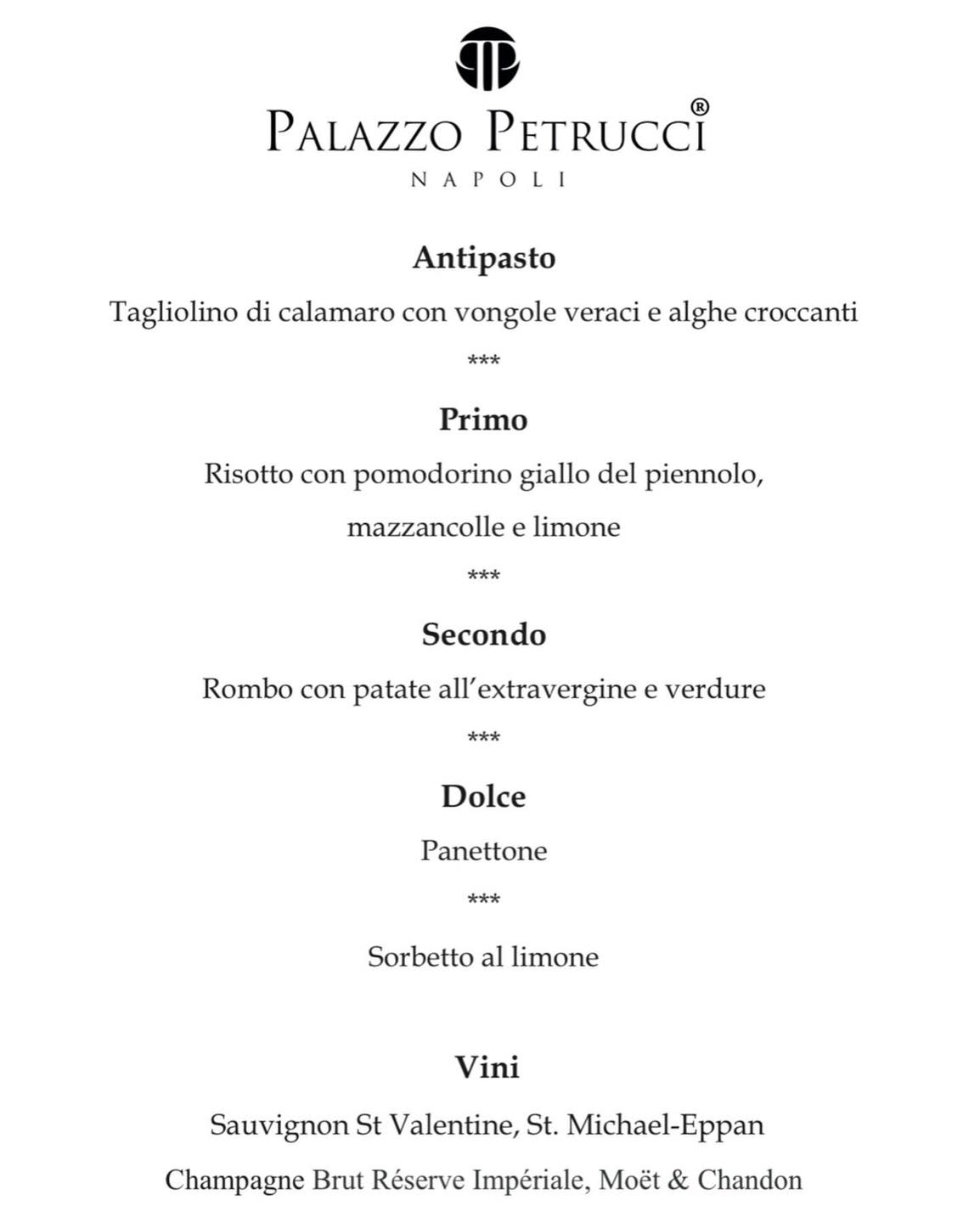 E' in corso a Palazzo Petrucci la consueta cena di Natale della SSCNapoli. Di seguito il menù della serata voluta e organizzata dal presidente Aurelio De Laurentiis.