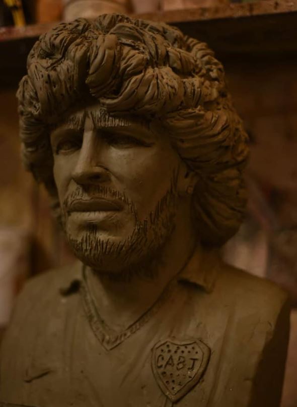 Lo scultore Leopoldo Santaniello della 'Bottega Artigiana' di Nola, in provincia di Napoli, ha omaggiato Diego Armando Maradona con un bellissimo busto con la maglia del Boca Juniors. Presto ne realizzerà uno anche con quella del Napoli. Dalla foto si evince la somiglianza notevole, la cura dei dettagli, i folti capelli ricci e la barba realizzata nella tipica cartapesta nolana. Bellissima statua per el Pibe de Oro. Il suo messaggio: "E' stato un mese di passione assoluta , spero di rendere omaggio degnamente al suo volto. Cartapesta Nolana prima fase : argilla".