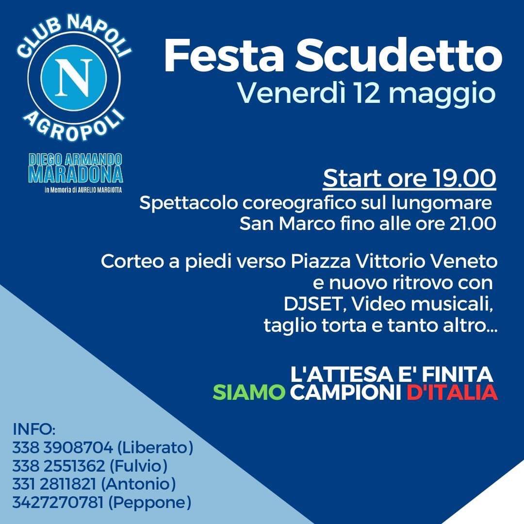 Il Club Napoli Agropoli festeggia la vittoria del terzo scudetto del Napoli con un evento organizzato per venerdì 12 maggio. Il programma dei festeggiamenti prevede il raduno alle ore 19 sul lungomare di Agropoli, uno spettacolo coreografico fino alle ore 21. A seguire, un corteo a piedi fino alla piazza principale del centro storico cittadino e poi dj set, video musicali e taglio della torta. Di seguito la locandina dell'evento.