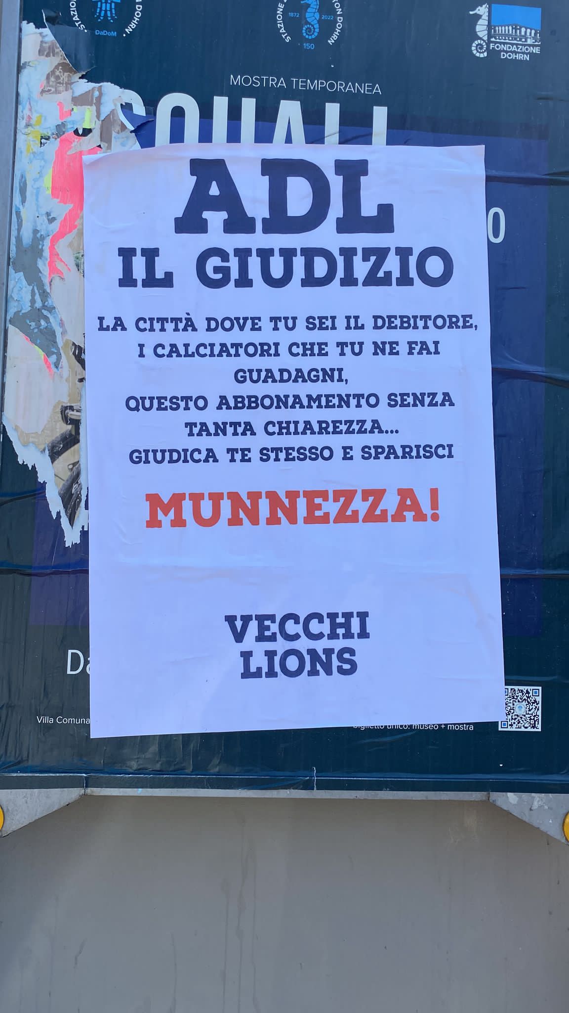 "ADL il giudizio. La città dove tu sei il debitore, i calciatori che tu ne fai guadagni, questo abbonamento senza tanta chiarezza. Giudica te stesso e sparisci!" è quanto si legge in un altro volantino esposto in città contro De Laurentiis presente all'estero dello stadio Maradona. Ecco la foto: