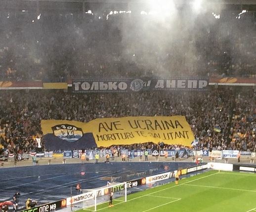 Che fosse una partita di estrema importanza per tutta l'Ucraina, lo si era capito. Non solo tifosi del Dnipro, ma anche supporters di altre squadre sono accorsi a Kiev per incoraggiare una squadra che rappresenterà tutta la nazione il prossimo 27 maggio a Varsavia, contro il Siviglia detentore del titolo. A dimostrazione di quanto il pubblico sentisse l'importanza del match, c'è uno striscione apparso sugli spalti dello stadio di Kiev, sul quale è stato riportato un messaggio che è considerato il saluto che gladiatori rivolgevano all'imperatore prima di entrare nell'arena per combattere: "Ave Ucraina, morituri te salutant" che in italiano viene tradotto: "Ave Ucraina, coloro che stanno per morire ti salutano". Immagine riportata dal portale prosport.tsn.ua