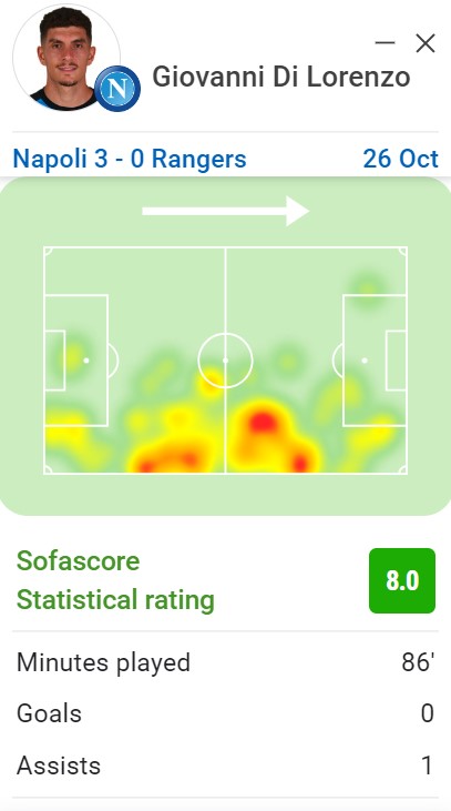 Questo discorso trova probabilmente la sua massima espressione nella partita disputata dal capitano Giovanni Di Lorenzo. Il terzino del Napoli ha di fatto giocato in tre ruoli: terzino destro, ma soprattutto ala destra e ancor di più mezzala. Da un suo cross dalla trequarti è arrivato il gol del vantaggio, ma Di Lorenzo ha avuto soprattutto il compito di non dare punti di riferimento agli avversari: ha spianato la strada a Politano ed è entrato sistematicamente nel campo per impostare la manovra da interno. Che è poi l'evoluzione calcistica di Joao Cancelo nel City di Guardiola. Di seguito l'heatmap prodotta da 'Sofascore.com'.
