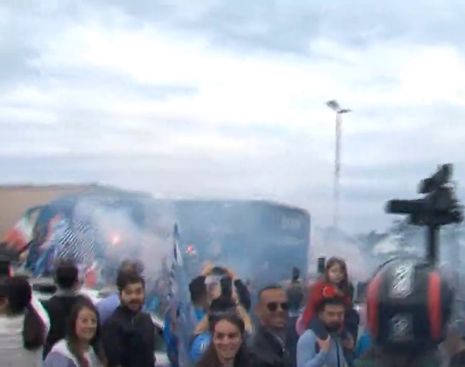 Il pullman del Napoli è appena partito da Pozzuoli, dove gli azzurri erano in ritiro da stamani, in direzione Fuorigrotta. L'autobus del Napoli si è fatto strada tra un'incredibile moltitudine di tifosi che con bandiere e fumogeni salutavano il passaggio dei loro beniamini. Di seguito lo scatto.