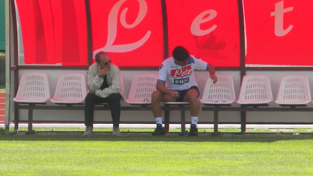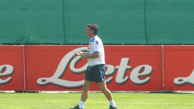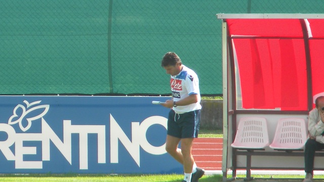 Al termine della seduta tattica è tornato in panchina il tecnico del Napoli Walter Mazzarri. L'allenatore di San Vincenzo ha cominciato ad annotare quanto visto durante la mezz'ora in cui la squadra s'è allenata sotto i suoi precisi dettami. L'allenatore del Napoli - come evidenziato dalle foto - ha rivisto i suoi appunti mentre la squadra proseguiva l'allenamento con il suo staff.