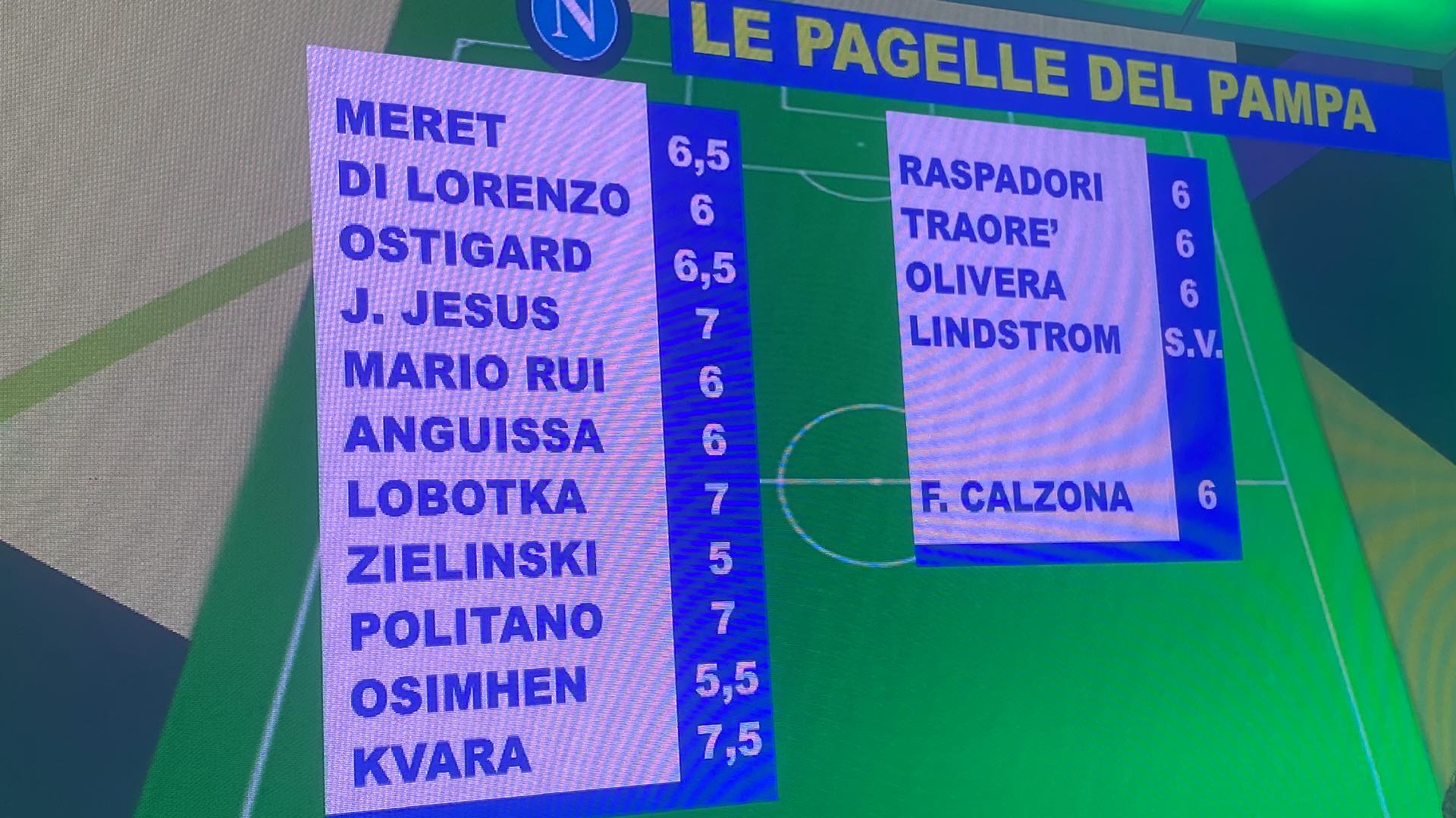 Ecco le pagelle dell'ex azzurro Pampa Sosa per la partita del Napoli contro il Torino, terminata sul risultato di 1-1 con le reti di Kvaratskhelia e Sanabria, nel corso della Partita dei campioni su Tele A. L'ex attaccante azzurro elegge come migliore Kvaratskhelia con un sontuoso 7,5. Premiati con il 7 in pagella anche Juan Jesus, Lobotka e Politano. Bocciatura totale per Zielinski che riceve un 5, insufficiente anche Osimhen che esce con 5,5 mentre Meret salva nel primo tempo e non ha alcuna colpa sul gol del Torino. Di seguito la pagella completa.