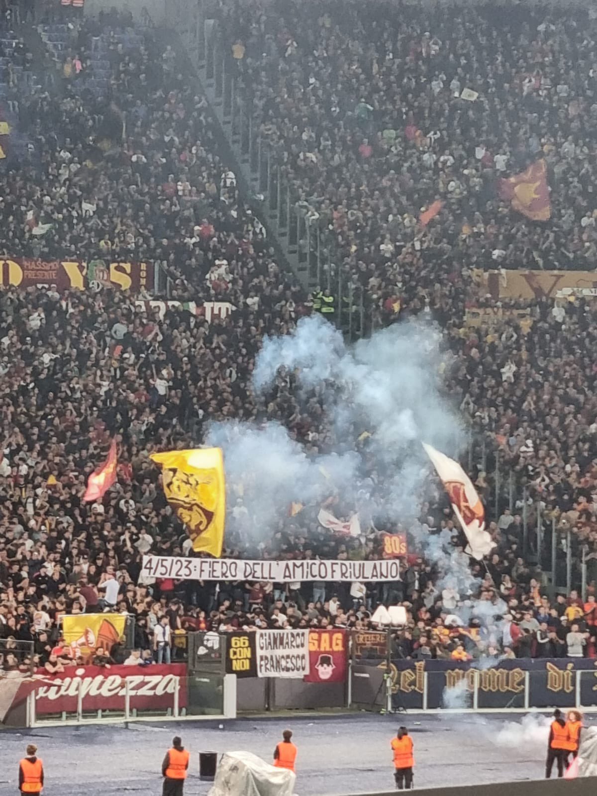 FOTO - Roma, striscione vergognoso all'Olimpico: "4-5-23 - Fiero dell'amico friulano"