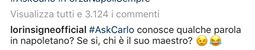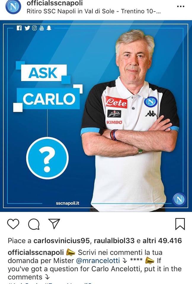 Simpatico siparietto social tra Carlo Ancelotti e Lorenzo Insigne: nel post Instagram della SSC Napoli che invita i tifosi a pubblicare domande per il tecnico azzurro, il Magnifico ha pubblicato un irriverente commento per il mister "Conosce qualche parola in napoletano? Se sì, chi è il suo maestro?".