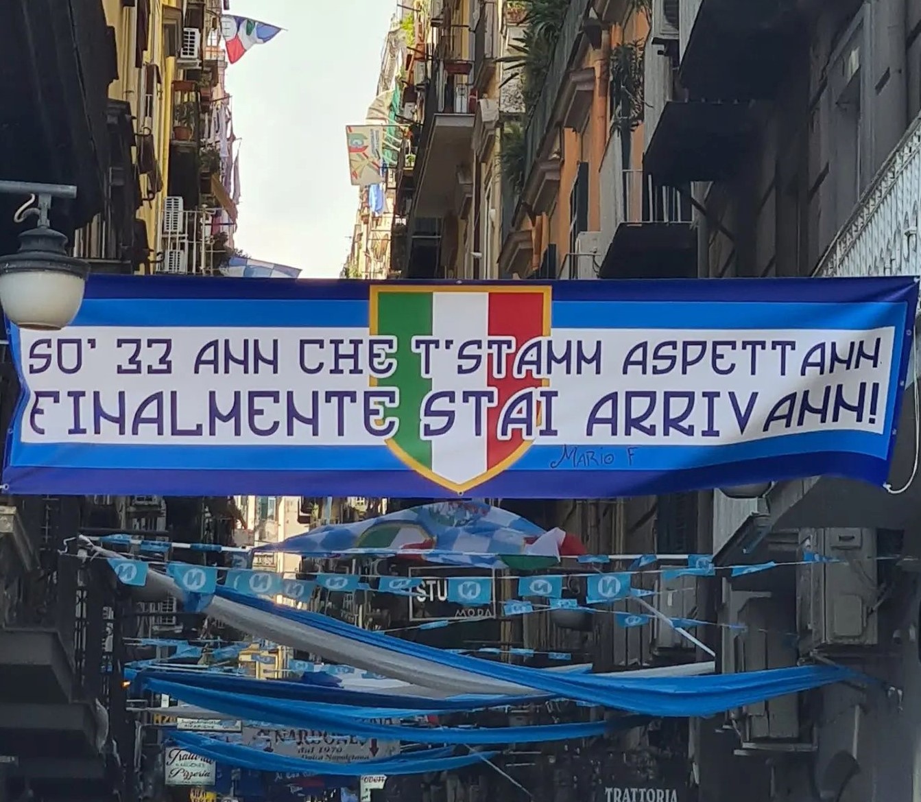 Napoli sempre più azzurra, strade e vicoli della città vengono di ora in ora sempre più addobbati in vista del terzo scudetto. In pieno centro, a via Nardones, nei pressi di Piazza Trieste e Trento, è stato esposto un mega striscione che recita: "Sò 33 anni che t' stamm aspettann. Finalmente stai arrivann!". Di seguito lo scatto già virale sui social.