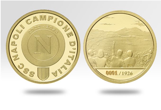 Sono state presentate oggi alla Zecca di Stato le medaglie celebrative per il terzo Scudetto del Napoli. Una in oro (1.926 euro) e l'altra in argento (150 euro). Le medaglie saranno in prevendita a partire dalle 11 di lunedì 22 maggio sul portale dell’Istituto Poligrafico e Zecca dello Stato. La medaglia in argento sarà in vendita anche sul sito di Filatelia di Poste Italiane. Le medaglie potranno essere acquistate a partire dal prossimo 5 giugno presso il punto vendita dell’Istituto Poligrafico e Zecca dello Stato “Spazio Verdi”, situato in piazza Verdi 1 a Roma, e negli uffici postali, solo per la versione in argento.