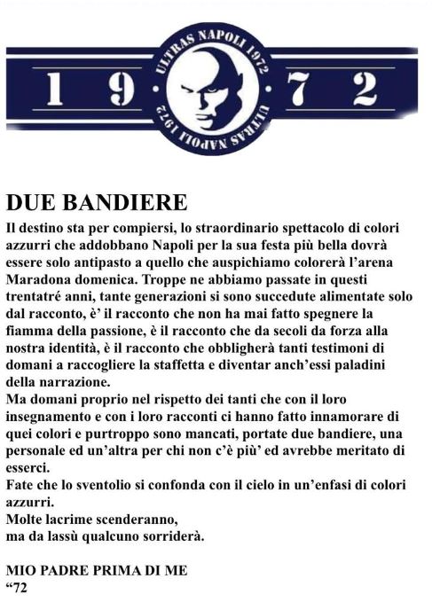 Una bella, bellissima idea quella che gli Ultras 72 hanno reso pubblica con un volantino diramato oggi: in occasione di Napoli-Salernitana, che potrebbe valere l'aritmetica dello Scudetto, viene chiesto ai tifosi di portare al Maradona due bandiere, una personale e l'altra per chi non c'è più e non potrà assistere al terzo Tricolore della storia. Di seguito il volantino di uno dei gruppi organizzati della Curva B.