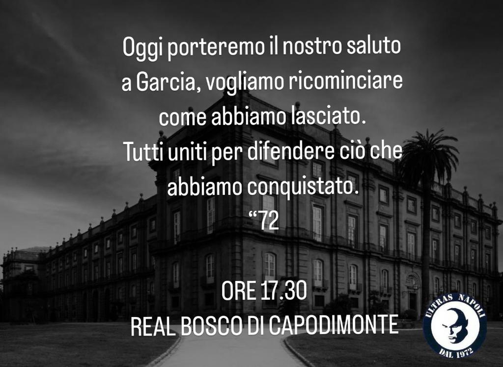 “Oggi porteremo il nostro saluto a Garcia, vogliamo ricominciare così come avevamo lasciato. Tutti uniti per difendere ciò che abbiamo conquistato”. Così recita un volantino firmato ultras Napoli, che assicurano dunque il loro sostegno al tecnico che sarà presentato oggi a Capodimonte nella splendida cornice della Reggia.