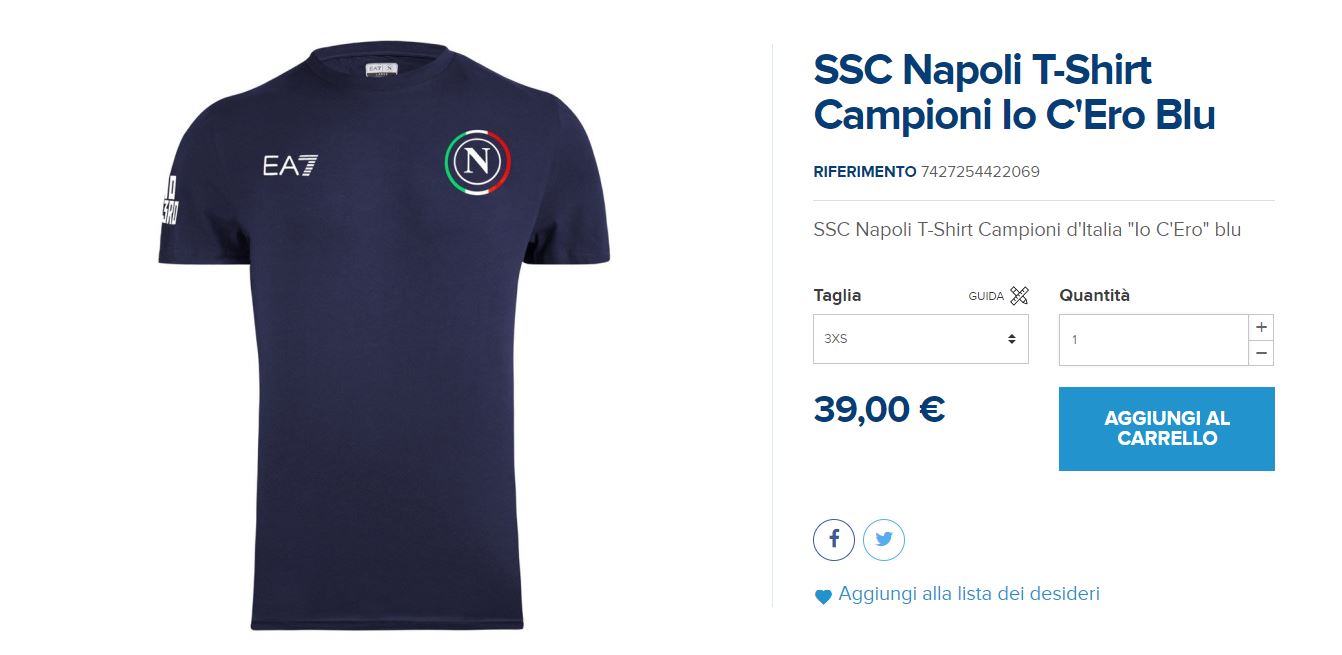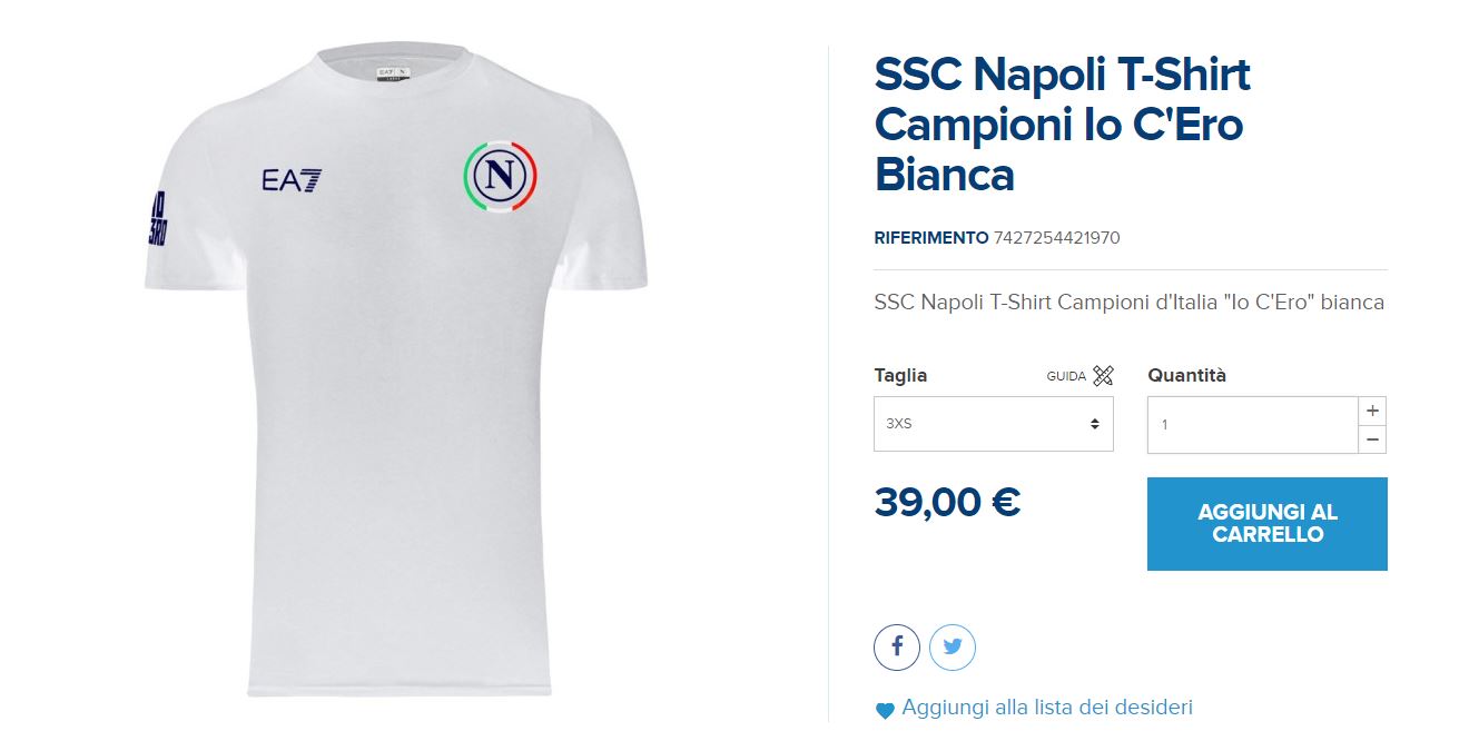 Il Napoli ha messo in vendita le nuove maglie che celebrano lo Scudetto della scorsa stagione. "Io c'ero!", si chiama la nuova versione, venduta sia nella versione bianca che nella versione blu navy. Entrambe al prezzo di 39 euro cadauna. Di seguito gli scatti presenti sull'official store del club sulla piattaforma eBay.