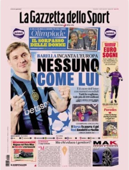 Oltre all'impressionante vittoria dell'Inter ottenuta in casa del Bayern Monaco, all'Allianz Arena ha brillato una stella in nerazzurro ed è Nicolò Barella: "Nessuno come lui", titola in prima pagina La Gazzetta dello Sport. È il cuore pulsante dell'Inter, con numeri mondiali: tutti lo vorrebbero ma ha una valutazione di oltre i 100 milioni di euro.